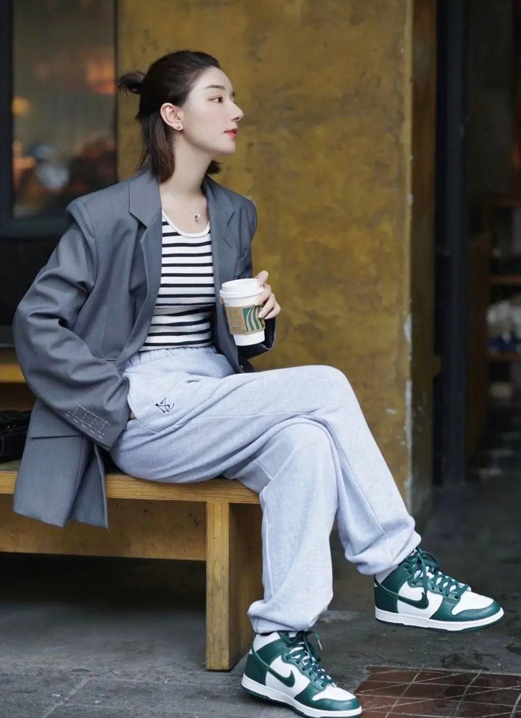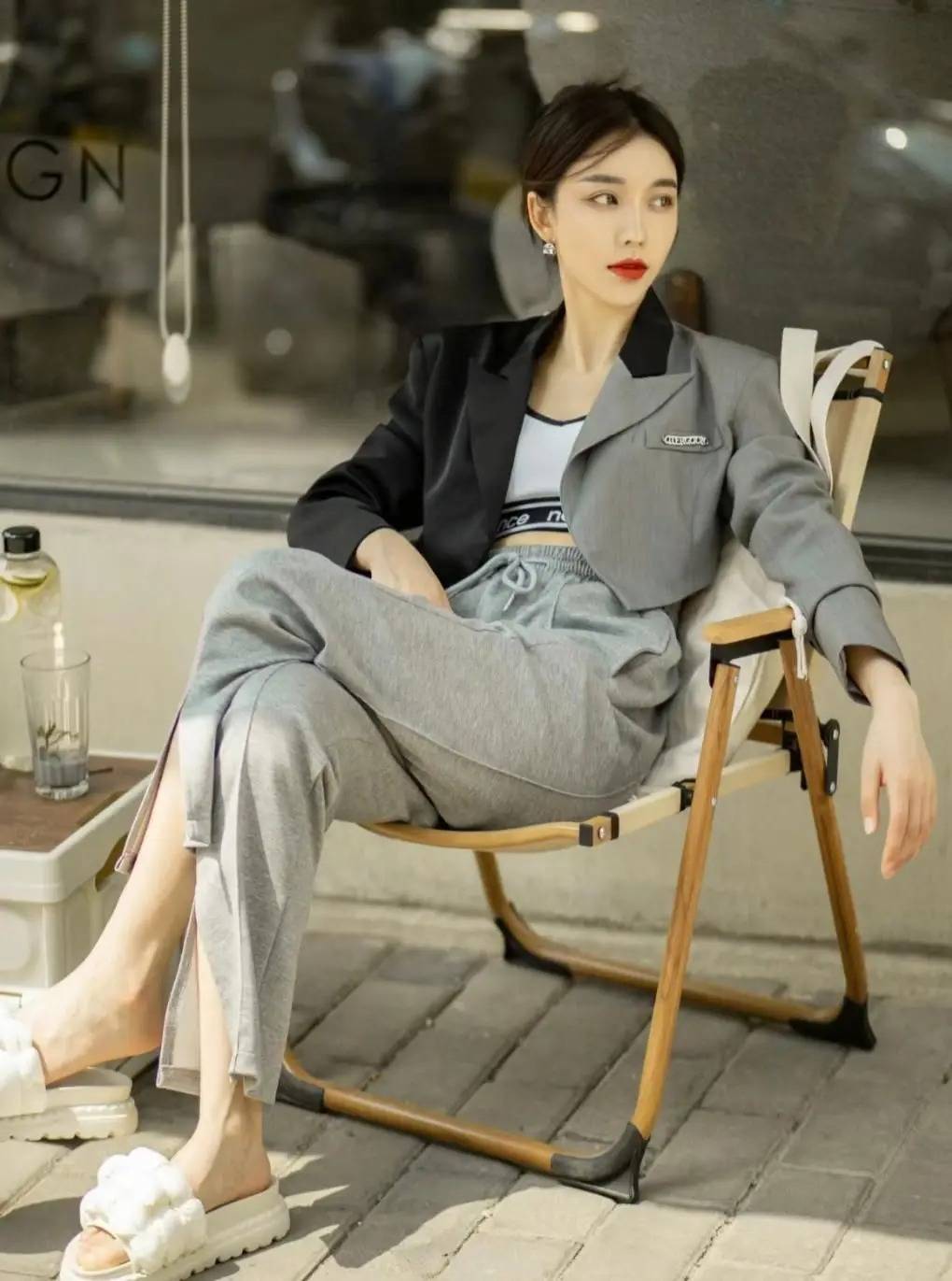 说到“下身运动”的单品选择,可简单理解为追求极致舒适与放松的运动裤。其中,卫裤是理想之选。像殷桃穿的这款束脚运动裤,融合休闲与时尚元素,与西装搭配时,不仅散发慵懒气息,更不经意间流露独特时尚魅力。